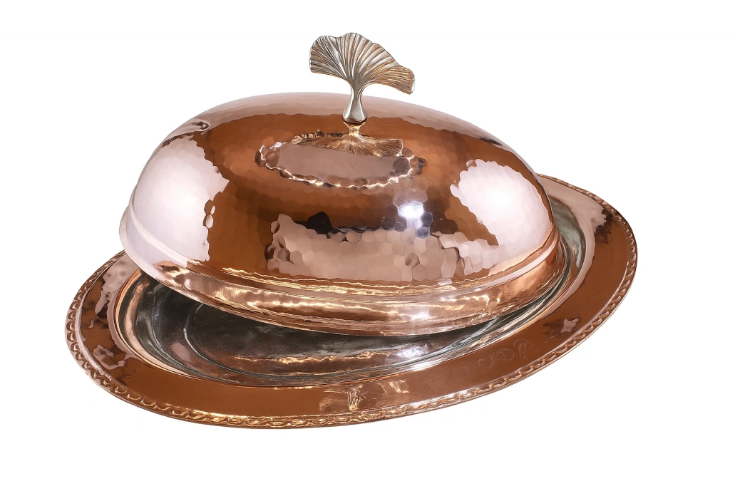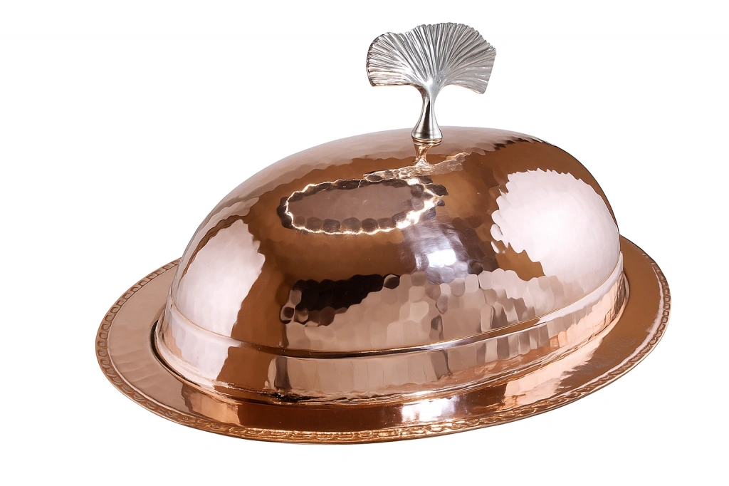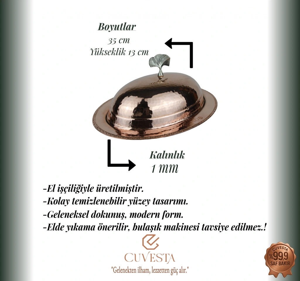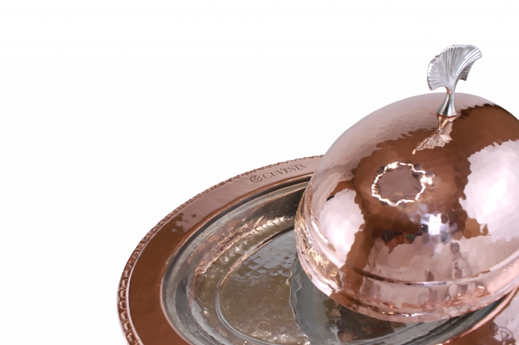El işçiliğiyle üretilen bu özel CUVESTA bakır sunumluk, geleneksel dövme tekniğiyle modern kırmızı tonun zarafetini bir araya getirir.