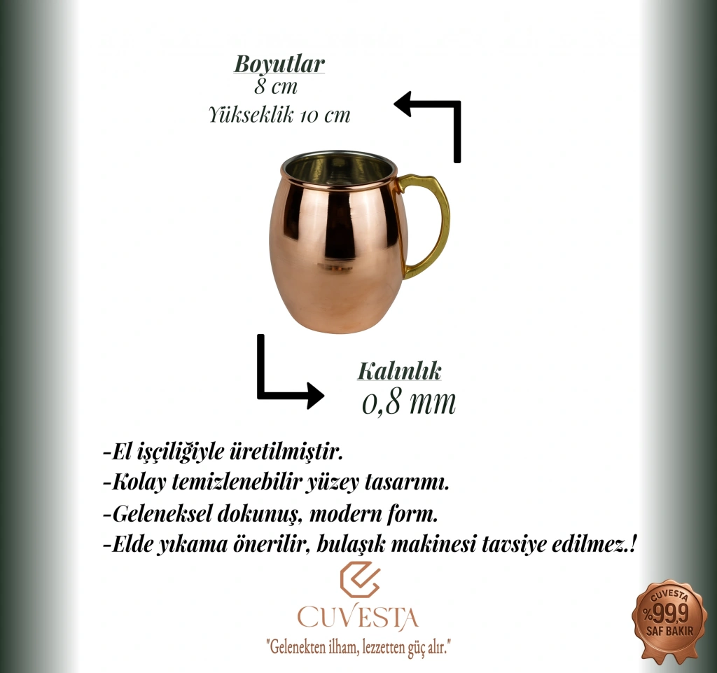 El işçiliğiyle üretilen bu özel CUVESTA bakır bardak, geleneksel dövme ustalığını modern tasarım anlayışıyla buluşturan zamansız bir eserdir.