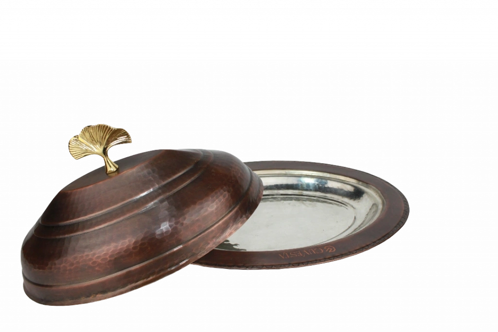El işçiliğiyle üretilen bu özel CUVESTA bakır sunumluk, geleneksel dövme tekniğiyle modern kırmızı tonun zarafetini bir araya getirir.